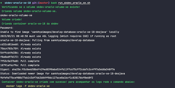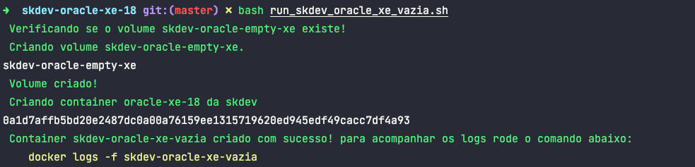Ele vai criar o volume do container, e criar um container oracle-xe sem dados, a primeira vez desse processo pode demorar um pouco por causa do download/pull da imagem.
