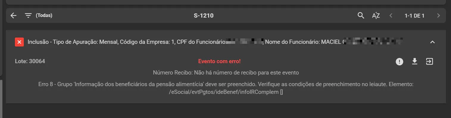 Hoje me deparei com o seguinte erro no e-Social ao tentar enviar o S-1210: